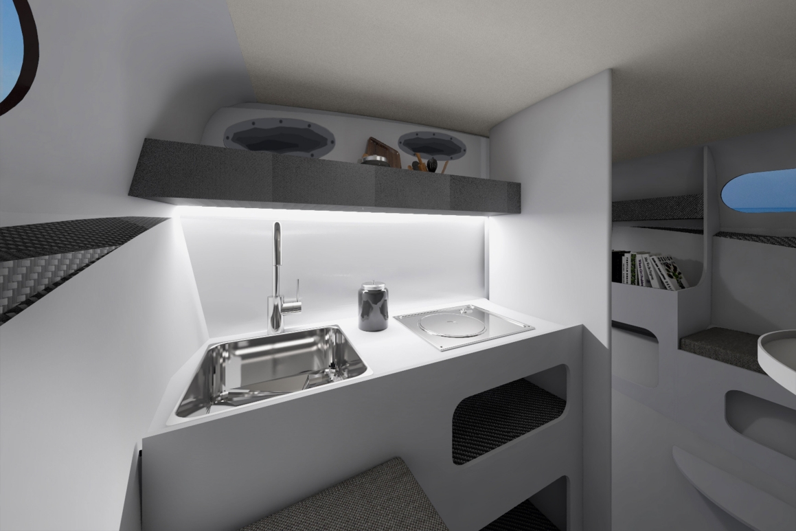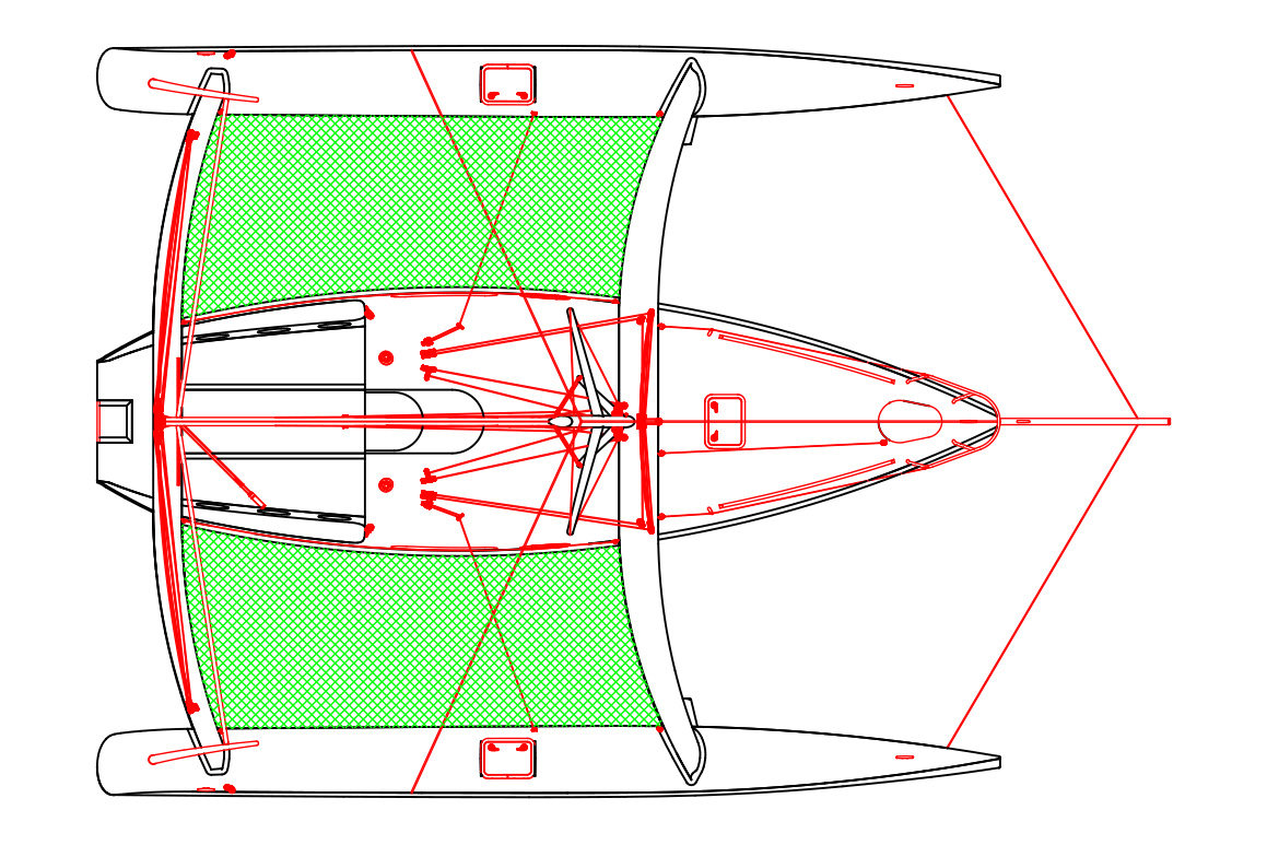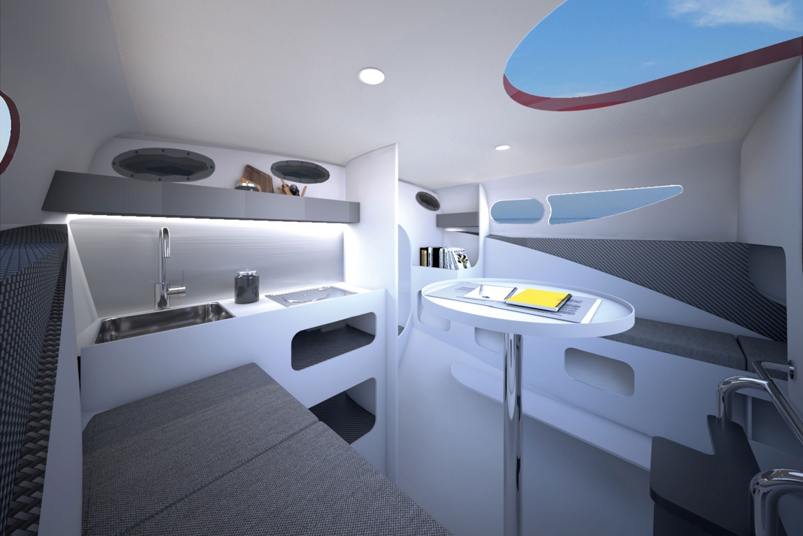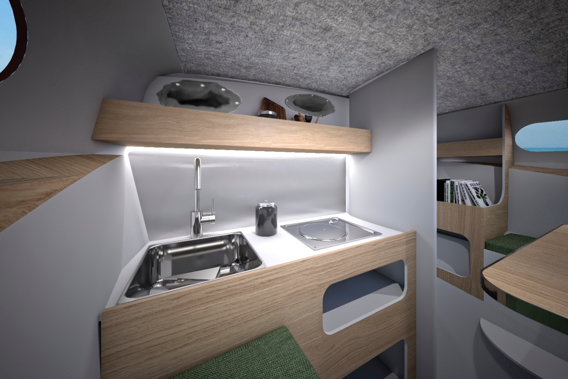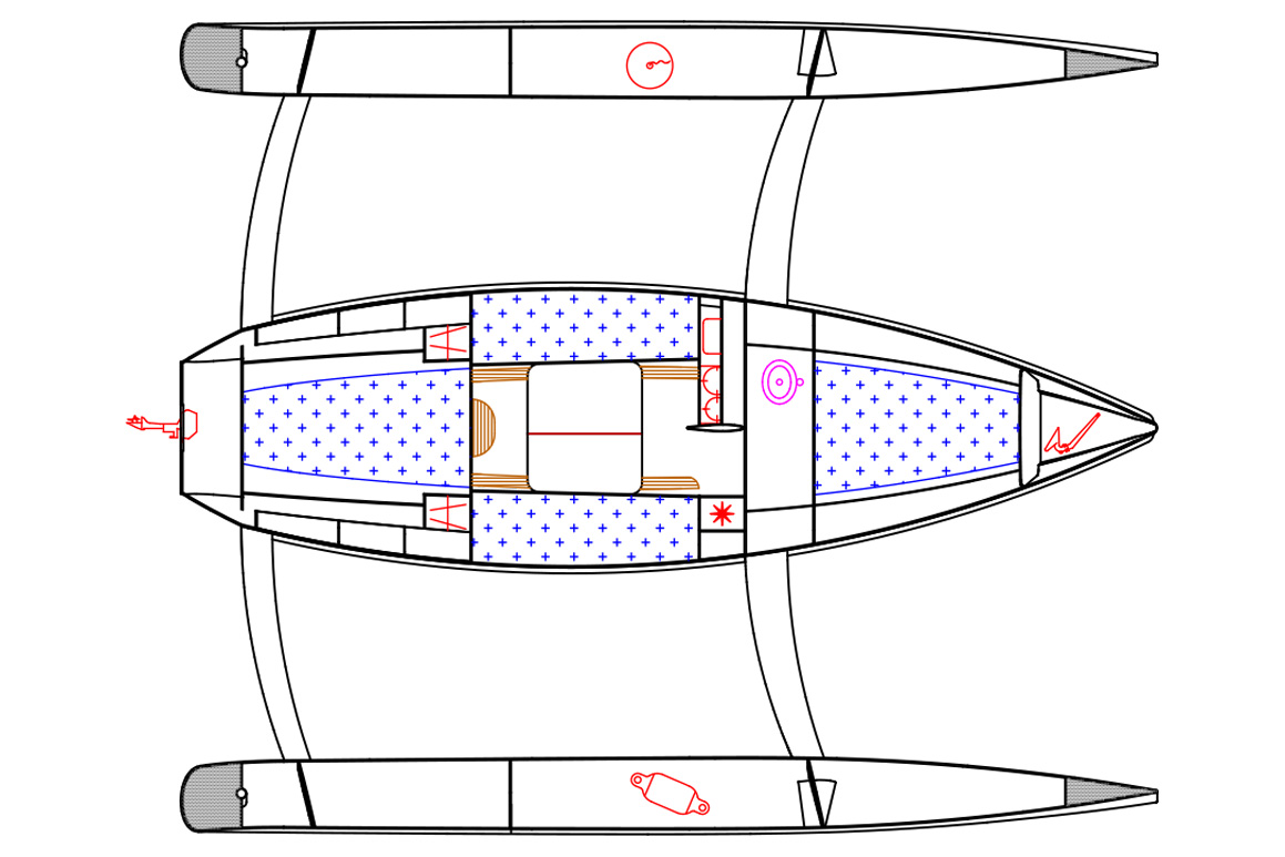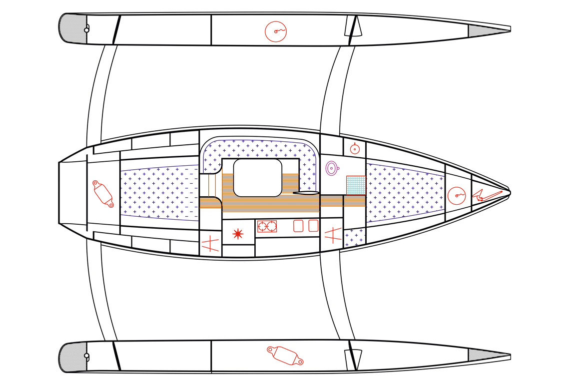 To meet the requirements of such journeys we will equip the trimaran, among others features, with a deck-saloon, three to four functional cabins, WC and a shower, a heat recovery system from the galley, cutting-edge NKE electronics, and anything you and your companion need for this special journey.