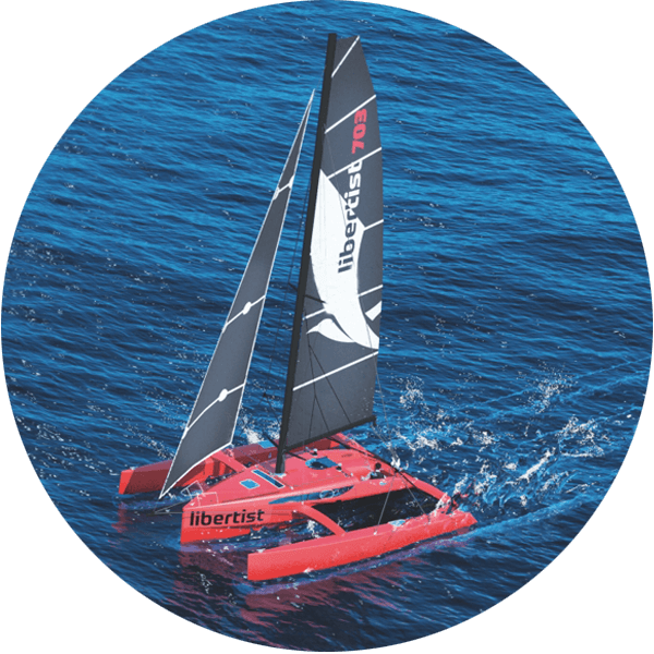 The 703 model has been designed by Erik Lerouge. It is quite light for her volume – it only weighs 1000 kg. We have equipped it, among other features, with hydrofoils, a carbon rotating mast and cutting-edge electronics.